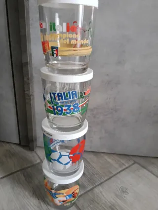 Set di 3 bicchieri in vetro della Nutella, edizione limitata del 2006. Sono decorati con immagini legate alla Nazionale Italiana di calcio. I bicchieri sono in ottime condizioni. - Perfetti per collezionisti o amanti del calcio. - Sono inclusi 3 bicchieri. - Sono in vetro trasparente e presentano immagini a colori.