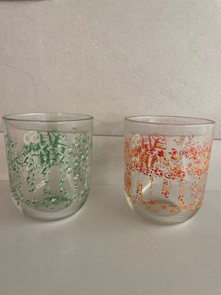 Set di 2 bicchieri Nutella per celebrare i 50 anni. - Design con silhouette di persone e cuori. - Decorazione con il numero 50 e la lettera 'n'. - Un bicchiere ha decorazioni verdi, l'altro arancioni.