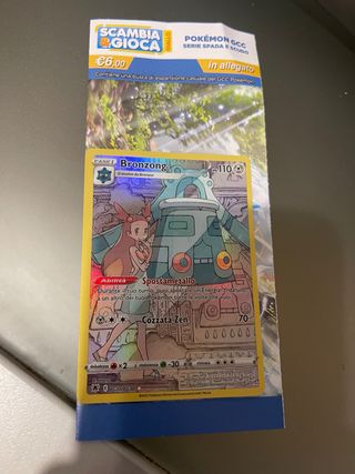 Carta Pokémon GCC di Bronzong, Fase 1. La carta presenta l'abilità Spostametallo e l'attacco Cozzata Zen. - Carta Pokémon Bronzong - Fase 1 - Abilità: Spostametallo - Attacco: Cozzata Zen - Valore HP: 110 - Debolezza: Fuoco x2 - Resistenza: Psico -30 - Costo di ritirata: 3 - Codice carta: TG11G30