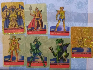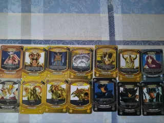 Set 14 metal cards dei Cavalieri dello Zodiaco, prodotte dalla Preziosi Collection e raffiguranti i personaggi e le armature della serie. Le cards sono metallizzate sulla facciata anteriore e riportano brevi descrizioni su quella posteriore. Cards disponibili: 7 Scorpio- 10 Micene- 18 Maestro dei 5 picchi - 22 Gemini - 26 Capricorn - 54 Andromeda - 66 Eris - 69 Armatura Ariete - 73 Armatura Leone - 80 Armatura Pesci - 81 Lady Isabel - 85 Pegasus Nero- 90 Andromeda Nero - 98 Cigno Nero. Possibilità di acquistare anche singole cards: - Cigno Nero, Armatura Pesci 0,50 cent - Armatura Ariete 0,40 cent - Tutte le altre 0,60 cent l'una
