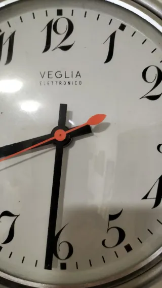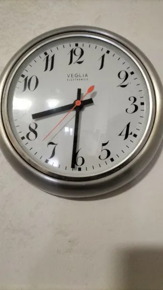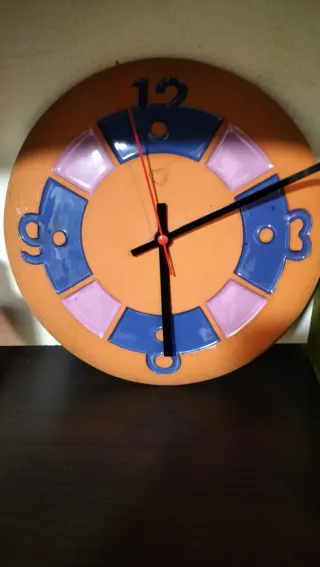 Orologio da parete con un design colorato e vivace. in terracotta - Base arancione. - Decorazioni a spicchi blu e rosa. - Numeri in rilievo. funzionante, ma non il suo originale.