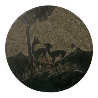 Raffinata placca decorativa con scena di cervi, risalente agli anni '30. - diamtero 20 cm spessore 6 mm - Soggetto: cervi in un paesaggio. - Materiale: ardesia - Epoca: anni '30. - artista Enrico Bertelli Chiavenna