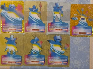 Set di 7 lamincards dei Cavalieri dello Zodiaco, Edibas 2008. Come si vede dalle foto la plastica di alcune lamincards è ingiallita. - Cavaliere di Gemini - Julian Kedives - Cavaliere di Leo - Abadir - Dragone Nero - Mizard - Sacra Armatura di Libra