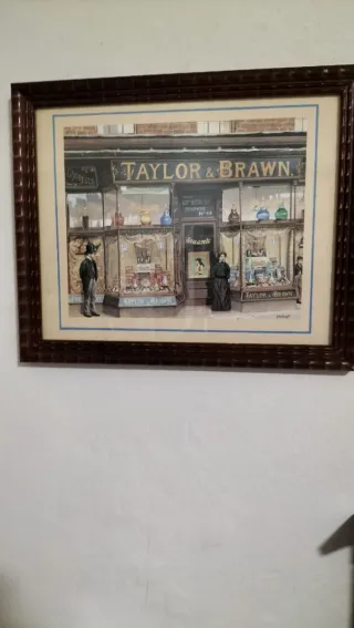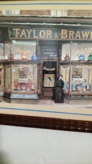 Quadretto raffigurante un negozio d'epoca Taylor & Brawn. - Dettagliata scena di strada con negozio e personaggi. - Cornice in legno scuro.