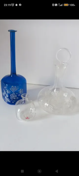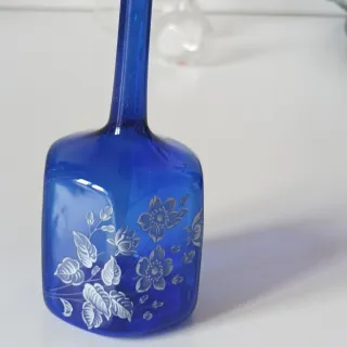 Set di tre bottigliette in vetro di Murano, decorate a mano con motivi floreali. - Bottiglietta blu alta con decorazioni bianche. - Bottiglietta trasparente piccola con decorazioni bianche. - Bottiglietta trasparente grande con tappo e decorazioni bianche.