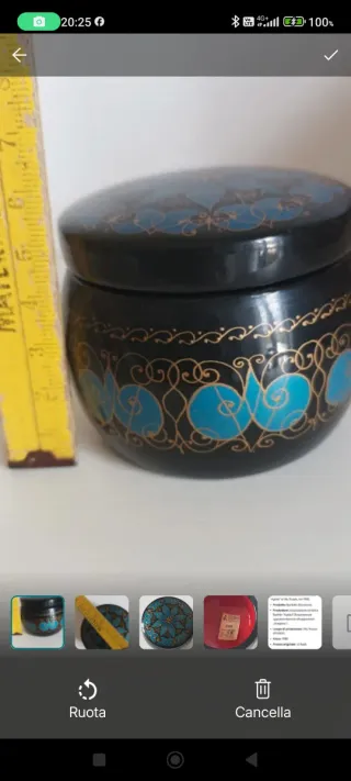 Elegante scatola o barilotto in legno laccato nero con un bellissimo decoro floreale blu e oro. - anno 1988 - Decorazione floreale centrale. - Dettagli in oro. - Finitura laccata lucida. - Proveniente dalla Russia
