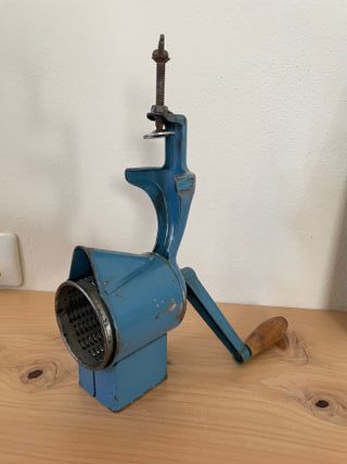 Stupenda grattugia da banco in metallo smaltato. Colore Azzurro, con manico in legno. Oggetto autentico, risalente agli anni '60, Prodotto in Cecoslovacchia dalla Jihokov di České Budějovice, utilizzato per grattugiare formaggio, noci e frutta secca. Si posiziona sul bordo del tavolo tramite la vite di regolazione. Posso fare spedizioni combinate con altri oggetti da me proposti