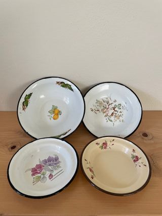 Set di quattro piatti in metallo smaltato, perfetti per aggiungere un tocco vintage alla tua casa. Ogni piatto presenta una decorazione floreale o a tema frutta. - Materiale: Metallo smaltato - Decorazioni: Motivi floreali e frutta - Quantità: 4 pezzi