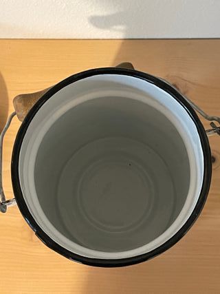 Vecchio contenitore da latte da 3 Litri realizzato in metallo smaltato con manico in legno Colore Bianco Dimensione altezza 30cm , Diametro base 14cm Ottimo come oggetto da arredamento in stile provenzale, country o come contenitore per fiori.