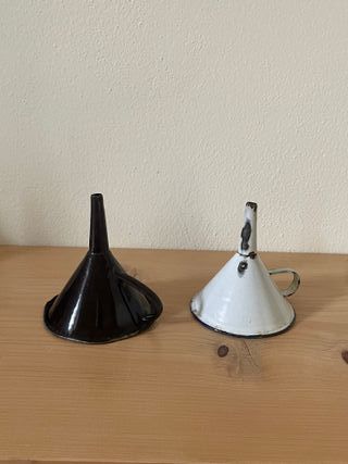 Vecchi Imbuti in latta smaltata, uno di colore bianco e uno Nero Diametro 10 cm Condizioni Buone con qualche segno del tempo, come da foto. Oggetto da collezione o esposizione Prezzo per acquisto di 2 imbuti, venduti singolarmente a 9€ ciascuno