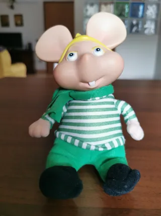 Iconico peluche di Topo Gigio, un classico intramontabile. - Peluche vintage. - Vestito con maglia a righe verdi e bianche e pantaloni verdi. - Sciarpa verde. - Piedi neri.