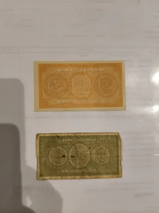 Due banconote storiche italiane del Ministero del Tesoro. - Banconota da 2 Lire, anno 1943. - Banconota da 1 Lira, anno 1943.
