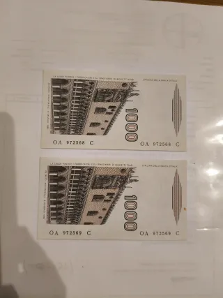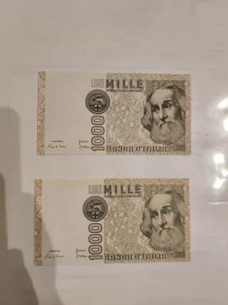 Due banconote da collezione Lire Mille della Banca d'Italia. - Valore nominale: 1000 Lire. - Emissione: Banca d'Italia. - Soggetto: Ritratto di uomo con barba e capelli lunghi.