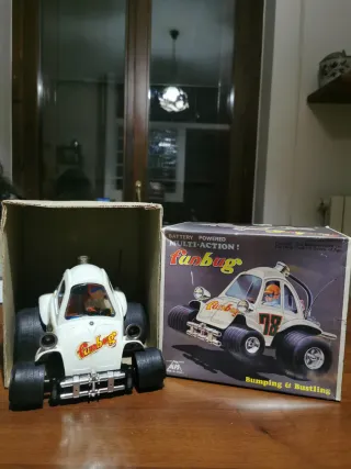 Auto telecomandata vintage Funbug in scala. Un classico giocattolo degli anni '70. Mancano I fanali i e non si granatisce il funzionamento, in quanto è da provare inserendo le batterie. - Design bianco iconico. - Ruote grandi e robuste. - Scatola originale inclusa.