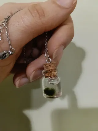 Un piccolo Marimo racchiuso in una bottiglietta di vetro con tappo di sughero, perfetto come portafortuna. - Collana in acciaio - Marimo originale. - Bottiglietta di vetro con tappo di sughero. - Collana inclusa.