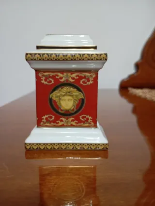 Elegante orologio Versace da tavolo in porcellana anni 90 con una base bianca e un corpo centrale rosso, impreziosito da decorazioni dorate. - Design classico e raffinato. - Dettagli in oro. - Base e parte superiore bianche - Per collezionisti