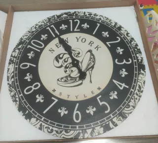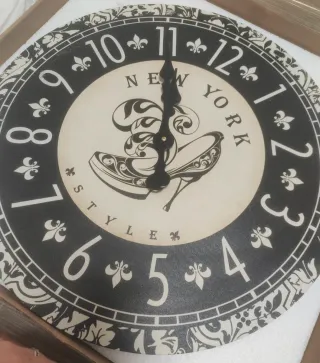 Orologio da parete con un design elegante e moderno, perfetto per aggiungere un tocco di stile alla tua casa. - Decorazione centrale con tacco alto e scritte New York Style. - Numeri romani e decorazioni floreali sul bordo.