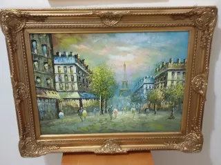 Dipinto antico raffigurante una scena parigina con la Torre Eiffel. - Cornice in stile barocco con finiture dorate. - Tecnica pittorica a olio su tela. - Rappresentazione di un viale alberato con edifici tipici. - 90x70