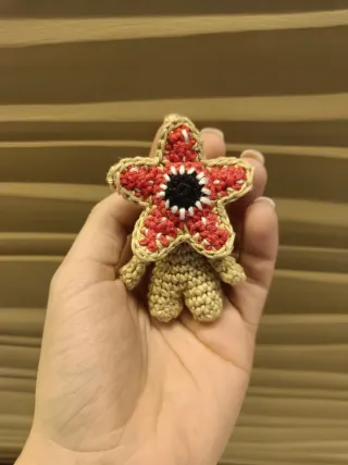 Mini Demogorgone realizzato all'uncinetto, ispirato alla serie. - Dettagli rossi e bianchi sul fiore. - Corpo e gambe in filato color sabbia. Possibilità di aggiungere ciondolo