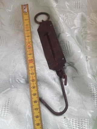 Bilancia a molla vintage in metallo arrugginito. - Anello superiore per appenderla. - Gancio inferiore per pesare. - Scala graduata visibile.