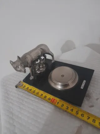 Statua in metallo della Lupa Capitolina con Romolo e Remo. - Base rettangolare in marmo nero. - Scritta ROMA sulla base.