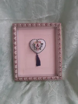 Deliziosa cornice decorativa a forma di cuore, realizzata in stile Capodimonte. Presenta una composizione floreale in rilievo e un nappa pendente. - Cornice con decorazione floreale. - Stile Capodimonte. - Nappa decorativa inclusa.