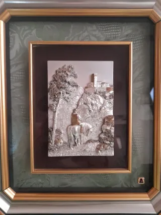 Bellissimo quadro vintage con una scena rurale in rilievo. - Raffigura un paesaggio con alberi, rocce e un borgo in lontananza. - Presenta due cavalli in primo piano. - Cornice ottagonale con finiture in oro e argento.