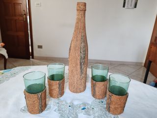 Bottiglia e 4 bicchieri rivestiti in sughero