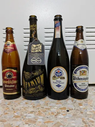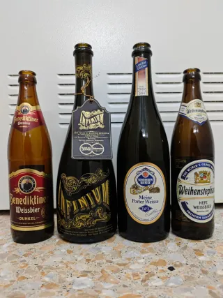 Collezione di bottiglie vuote di birra tedesca, perfette per collezionisti o decorazione. Le vendo anche singolarmente - Kaiserdom Dark Lager Beer, Schneider Weisse Helle Weisse, Benediktiner Weissbier Dunkel, Infinium, Weihenstephaner Meine Porter Weisse, Weihenstephaner Hefe Weissbier, Weihenstephaner Korbinian, Weihenstephaner Meine Hopfervi