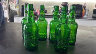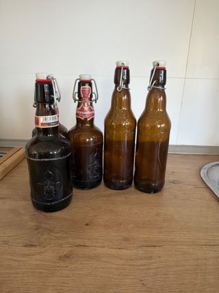 Set di bottiglie in vetro verde per birra. - Design classico con chiusura a gancio. - Ideali per conservare e servire bevande.