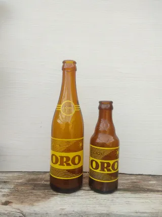 Due bottiglie di birra della marca Oro Export. - Bottiglia di dimensioni maggiori. - Bottiglia di dimensioni minori. - Colore ambrato.