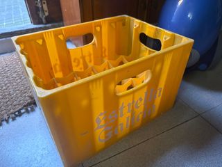Scatola di plastica gialla per bottiglie di birra Estrella Galicia. Ideale per collezionisti o per organizzare le bottiglie. Colore giallo vibrante. Design con maniglie per facilitare il trasporto. Scomparti interni per le bottiglie.