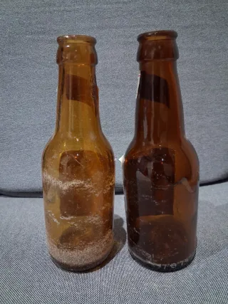 Coppia di bottiglie vintage, una di birra e una di frappè