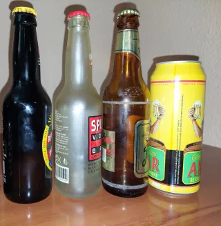 Set di cinque bottiglie di birra antiche. - Bottiglia El Águila - Bottiglia Mahou Madrid - Bottiglia El León - Bottiglia Cruz Blanca - Bottiglia El Águila amarilla especial - DISPONIBILE 4 LOTTI UGUALI A QUESTO Ideali per regalo di Natale e dei Re