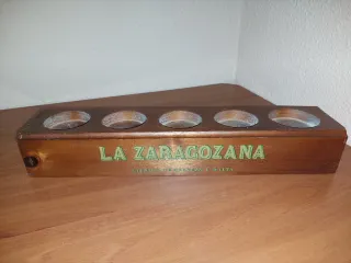 Vendo espositore in legno per birra La Zaragozana Ámbar. Design rustico in legno. Capacità per 5 bottiglie. In perfetto stato da collezione. Dimensioni: 17,50 cm di larghezza, 2,70 cm di altezza, 3,95 cm di lunghezza.