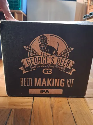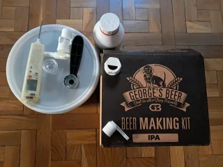 Kit per la produzione di birra artigianale George's Beer, sapore IPA. Include tutto il necessario per iniziare, ESCLUSI GLI INGREDIENTI. Con istruzioni. Include anche un termometro digitale da cucina e un barattolo di CHEMIPRO (1kg), utilizzato per la pulizia degli accessori e delle bottiglie. Il barattolo è aperto e manca circa un dito di prodotto.