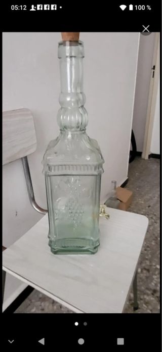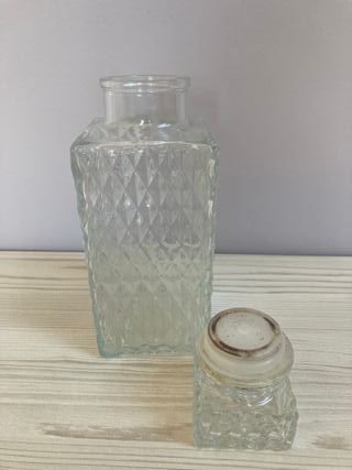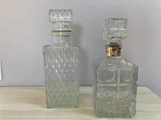 Bottiglie in vetro con un design elegante, ideali per liquori o come elemento decorativo. Include tappo di sughero. Materiale: vetro. Design: rettangolare con dettagli incisi. Chiusura: tappo di sughero. Due diverse dimensioni. 20 euro per due bottiglie.