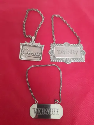 Set di tre placche per bottiglie di liquore, realizzate in argento sterling. - Placca Cognac 4 x 3 cm più catena - Placca Whisky 4 x 6 cm più catena - Placca Vermouth 2 x 4 cm più catena. TUTTE PESANO 40 GR.