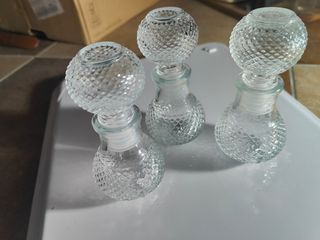 Set di tre piccole bottiglie in vetro, perfette per profumi o oli essenziali. - Design decorato con motivo a rombi. - Tappo sferico in vetro. - Ideali come bomboniere o decorazione. Colonia liquore profumo