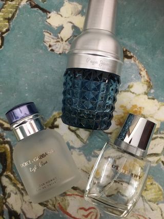 Set di tre bottiglie di profumo vuote, perfette per collezionisti o per riutilizzare. - Bottiglia Dolce & Gabbana Light Blue. - Bottiglia Burberry. - Bottiglia Pepe Jean London.
