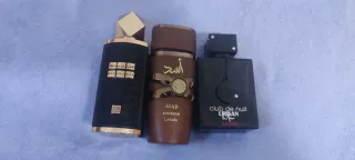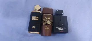 Tre bottiglie di profumo vuote, perfette per collezionisti o per esposizione. - Bottiglia nera con dettagli dorati. - Bottiglia marrone con design a nastro. - Bottiglia nera con tappo argentato......TUTTE VUOTE PER COLLEZIONARE.....