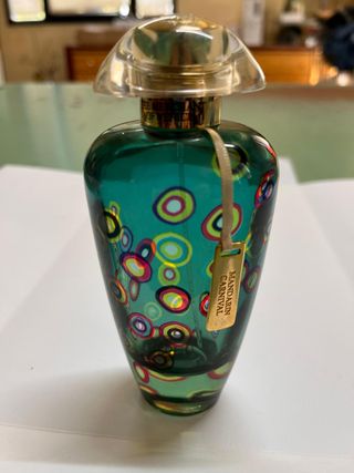 Elegante flacone vuoto per profumo italiano Mandarin Carnival – The Merchant of Venice dal design artistico e colorato. - Vetro di color verde smeraldo con cerchi multicolore stile Murano - Tappo in plastica trasparente e dorato. - Targhetta Mandarin Carnival dorata appesa con nastro. Perfetto come oggetto da collezione, decorazione per vanity table, bagno o vetrina. Flacone da profumo vuoto (circa formato 100 ml) ✔ Condizioni ottime ✔ Tappo originale incluso ✔ Flacone vuoto 🌿 Ideale per chi ama: • oggetti di design • flaconi di profumo artistici • collezionare bottiglie decorative