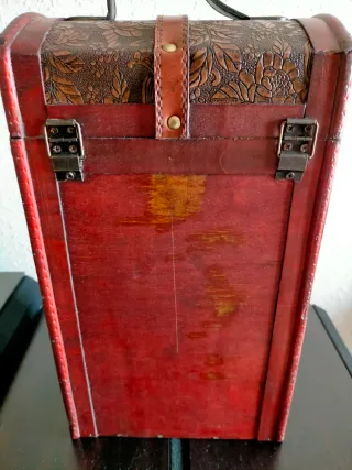 Scatola in legno con un design dipinto di una bottiglia di vino, un bicchiere e uva. Ideale per conservare o trasportare bottiglie. - Chiusura metallica. - Design artistico sul coperchio frontale. Dimensioni Lunghezza 21cm Altezza 36cm Profondità 12cm