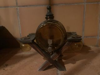 Set decorativo di mini bottiglie di vino. - Bottiglie in cristallo ambra. - Supporto in legno. - Include 4 mini calici.