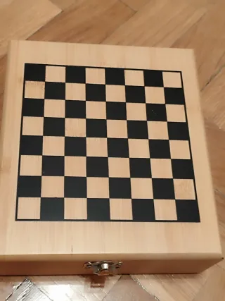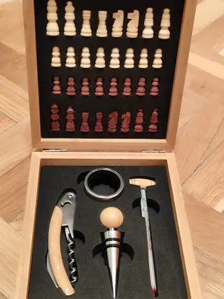 Set di scacchi e accessori per vino, presentato in una scatola di legno. Include: - Pezzi di scacchi in legno in due tonalità. - Cavavite in metallo e legno. - Tappo per bottiglie di vino. - Termometro per vino.