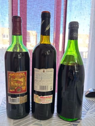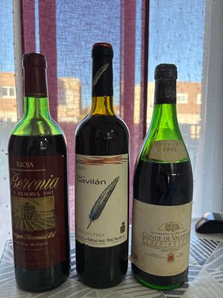 Lotto di tre bottiglie di vino rosso della collezione, non idonee al consumo, tappi deteriorati (alcuni più di altri, vedi foto). - Bodegas Beronia, Reserva 1981, Rioja. - Cepa Gavilán, 2002, Ribera del Duero. - Conde de Valdemar, Reserva 1981, Rioja. Prezzo per l'intero lotto.
