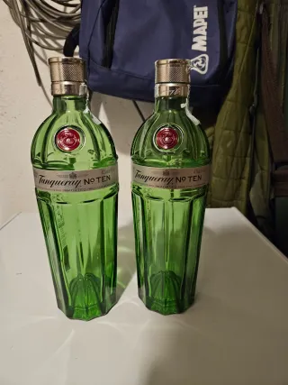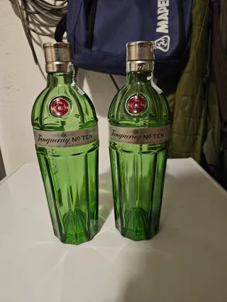 Due bottiglie vuote di Gin Tanqueray No. Ten. - Bottiglie in vetro verde. - Etichetta Tanqueray No. TEN visibile. - Tappo dorato con finitura zigrinata.