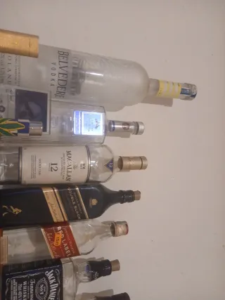 Offro offerte per il lotto a piacere. Sconto per maggiori acquisti dal profilo. Lotto di bottiglie vuote di diverse marche di liquori, alcune con dettagli decorativi. - Bottiglia di Belvedere Vodka. Con luce - Bottiglia di The Macallan 12 Anni. Venduta - Bottiglia di Johnnie Walker Double Black. Con luce - Bottiglia di Johnnie Walker Red Label. - Bottiglia di Jack Daniel's Old No. 7. Con luce - Bottiglia di champagne Moët con luce