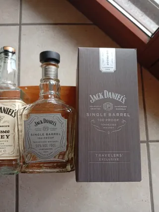 Set di due bottiglie vuote Jack Daniel's, perfette per collezionisti o per creare decorazioni uniche. - Una bottiglia Jack Daniel's Tennessee Honey. - Una bottiglia Jack Daniel's Single Barrel 100 Proof Travelers Exclusive.