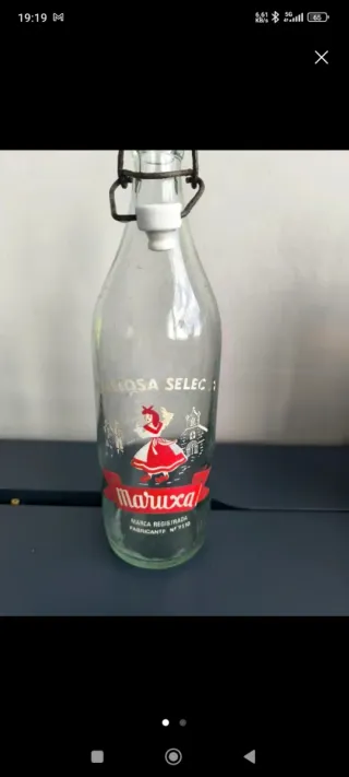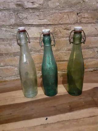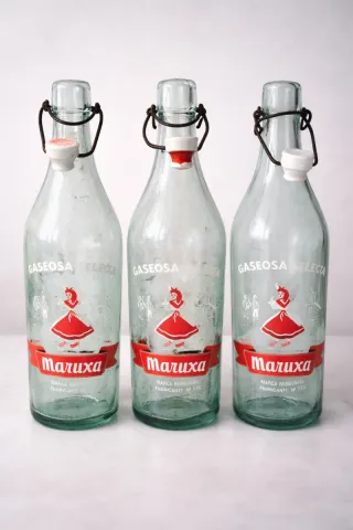 Set di tre vecchie bottiglie di gaseosa "Maruxa", originali, in vetro spesso con chiusura meccanica in ceramica e filo metallico. Pezzi autentici, con il fascino dell'uso e del tempo, ideali per collezionismo, decorazione vintage o scenografia. Dettagli: Marca: Maruxa, Materiale: vetro, Chiusura originale con porcellana e filo, Stato: usato, con segni normali di antichità. Le 3 bottiglie sono vendute insieme. Perfette per scaffali, cucine rustiche, bar, vetrine, cantine o collezioni di bevande antiche.